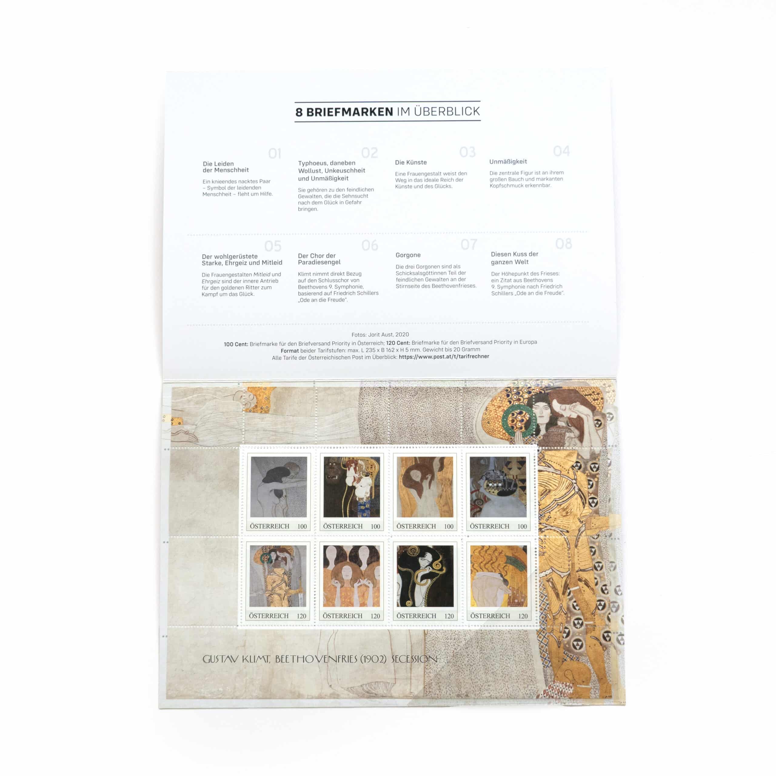 - Umfang: ein Markenblatt mit acht Briefmarken mit Motiven aus dem Beethovenfries, eingelegt in einen