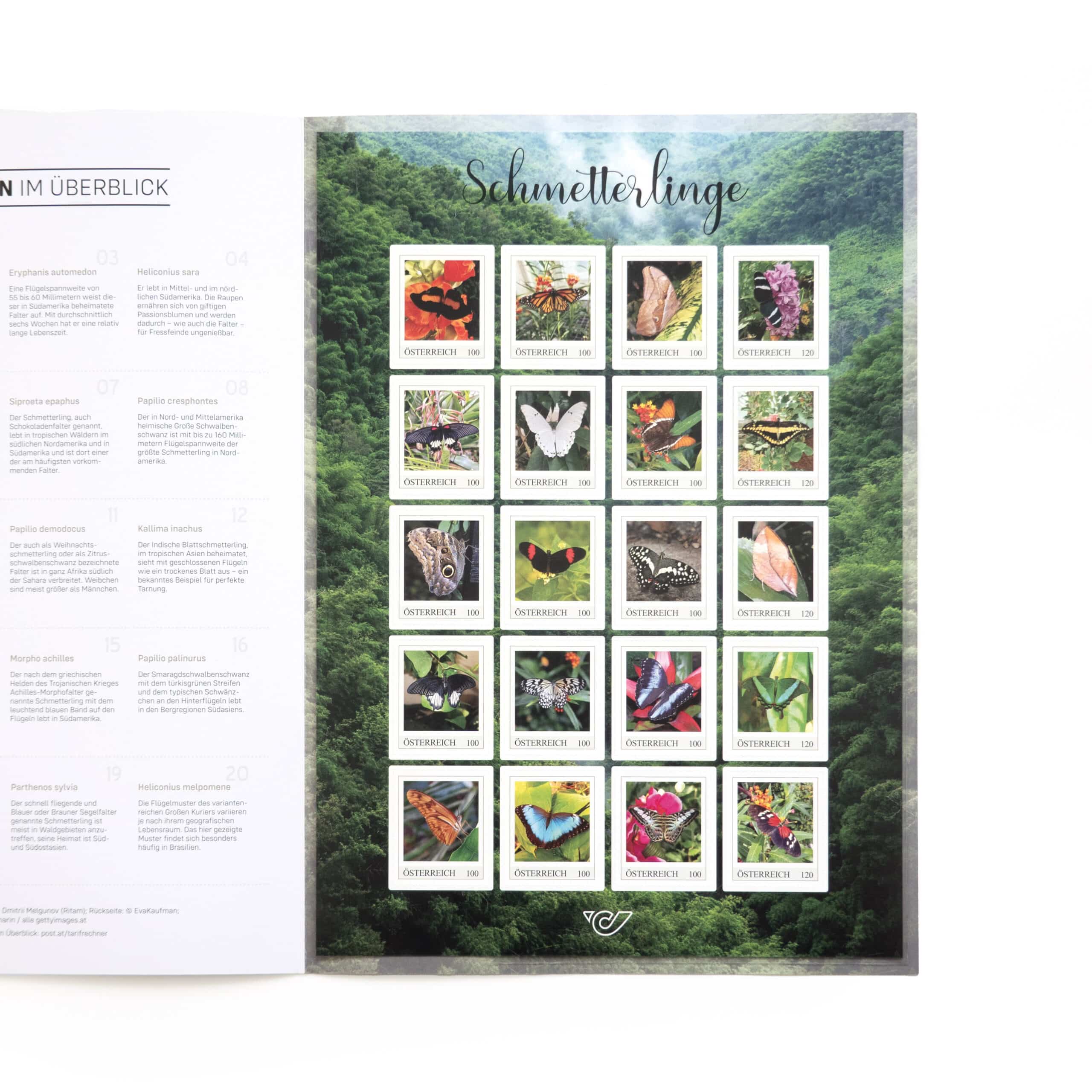 - Umfang: ein Markenblatt mit 20 selbstklebenden Briefmarken mit Motiven tropischer Schmetterlinge, eingelegt in einen 4-seitigen Folder A4+