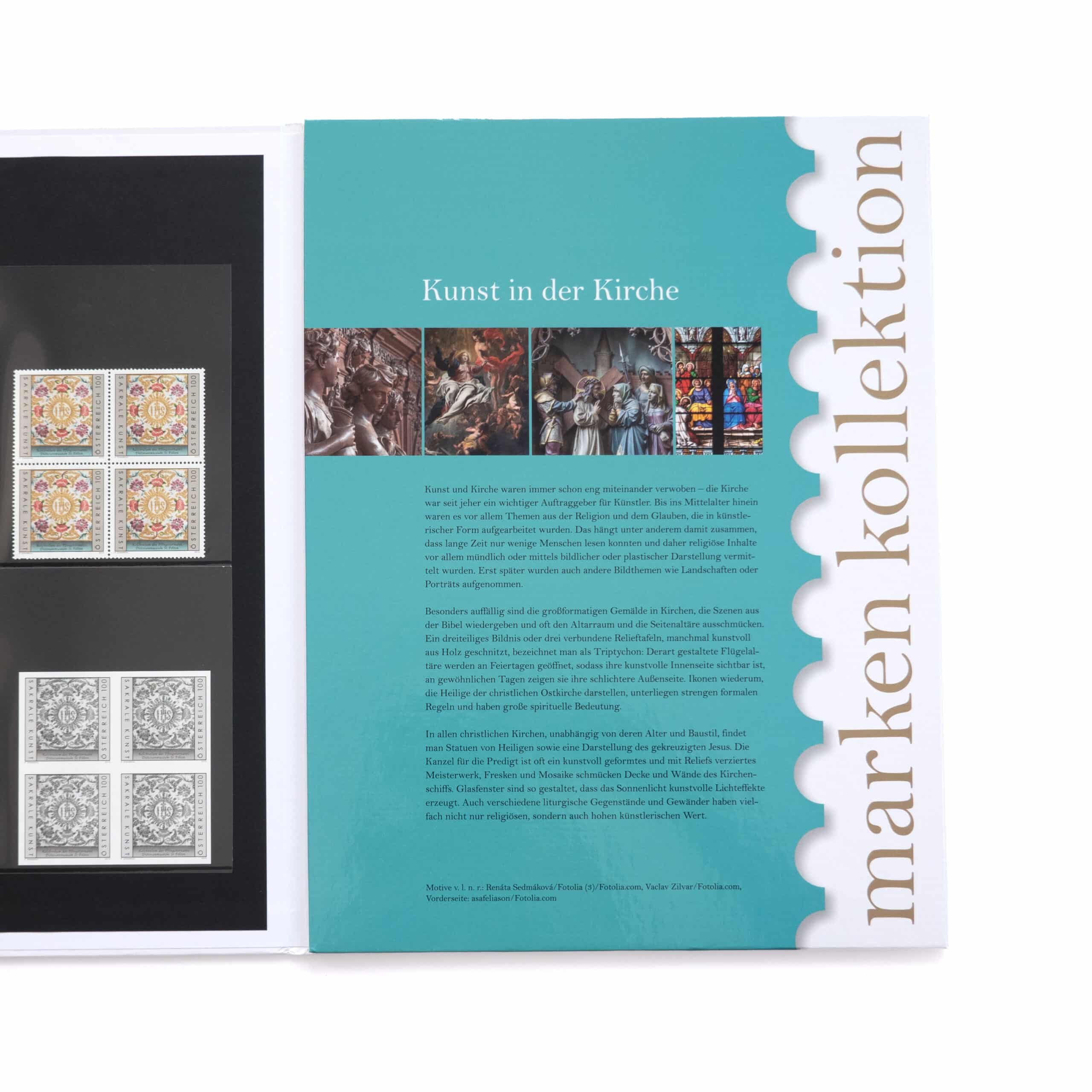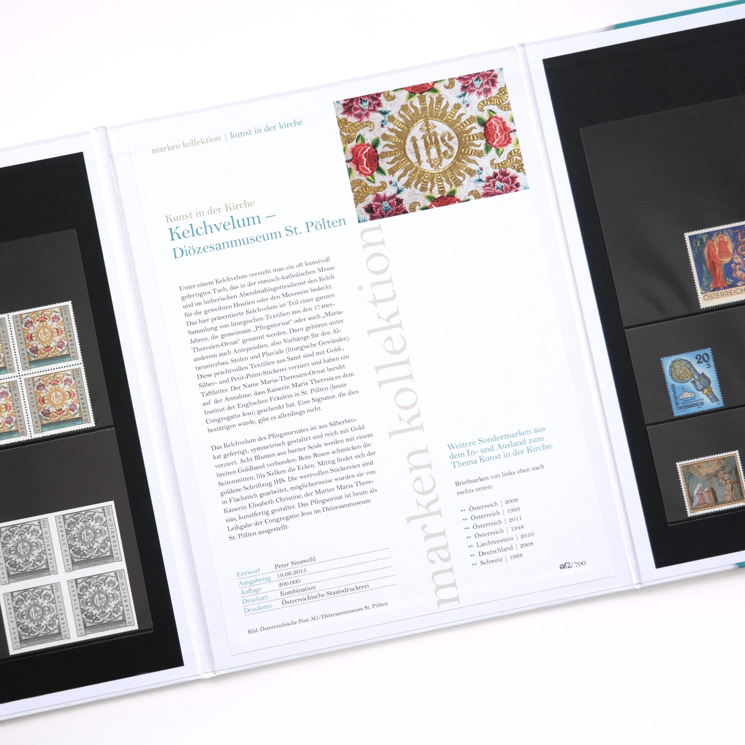 - Besonderheit: auf zwei mit Laschen versehenen Seiten sind Versionen der Sonderbriefmarke „Kelchvelum – Diözesanmuseum St. Pölten“ sowie sieben ältere Originalbriefmarken aus Österreich, Deutschland, Liechtenstein und der Schweiz eingelegt.